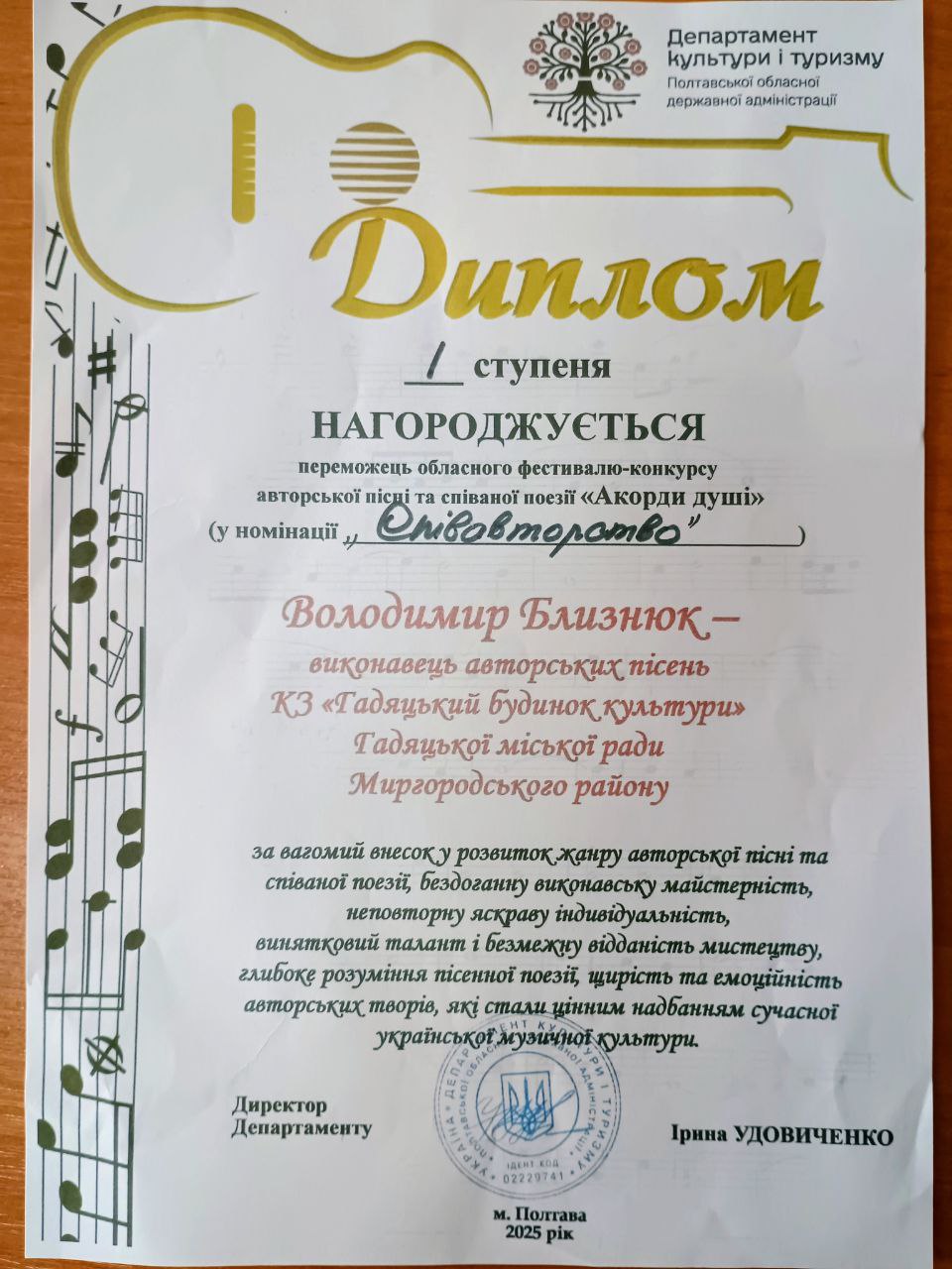 Від Гадяцької громади в конкурсі взяв участь у номінації «Співавторство» активний учасник культурно-мистецьких заходів нашого міста, талановитий Володимир Близнюк. Він представив твори на вірші нашого земляка Олександра Недовіса, демонструючи високий рівень майстерності та глибоке розуміння поетичного слова. Авторська пісня у виконанні Володимира Близнюка вразила слухачів своєю щирістю та емоційністю.