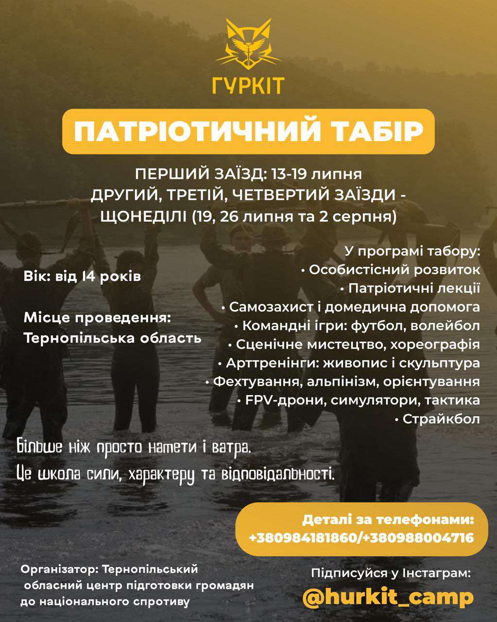 📅 Патріотичний табір «Гуркіт» для молоді від 14 років стартує 13 липня на Тернопільщині.