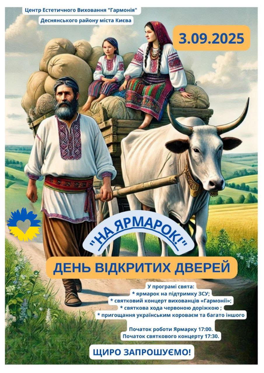 Запрошуємо всіх на особливу подію! Центр естетичного виховання “Гармонія” з розпростертими обіймами чекає на вас традиційного Дня відкритих дверей, який поєднається з Благодійним ярмарком на підтримку наших захисників – Збройних Сил України. Цей захід відбудеться 3 вересня о 17:00 год. Це чудова нагода провести час у творчій атмосфері, дізнатися більше про діяльність центру та зробити свій внесок у добру справу. На ярмарку ви зможете знайти унікальні вироби, виготовлені талановитими учнями та викладачами, скуштувати смаколики та насолодитися виступами юних артистів. Всі кошти, зібрані під час ярмарку, будуть передані на потреби ЗСУ. Ми віримо, що спільними зусиллями ми можемо досягти значних результатів і допомогти тим, хто боронить нашу землю. Долучайтеся до нас, щоб підтримати наших героїв та відчути атмосферу єднання та доброти. Чекаємо на вас з нетерпінням!