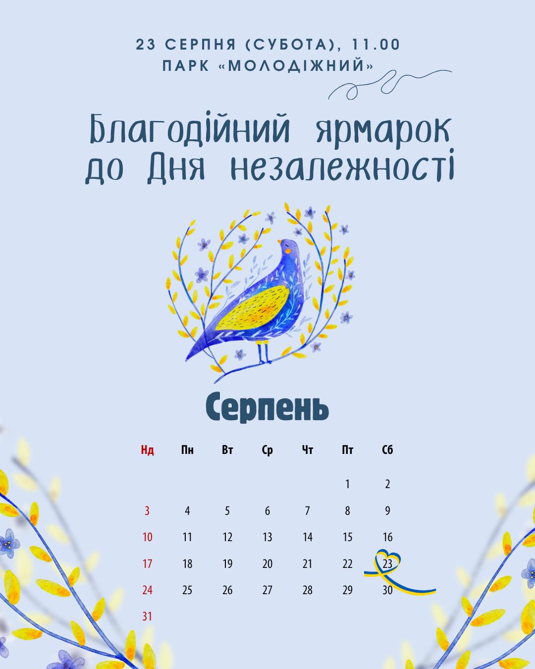 23 серпня (субота), об 11:00, ми збираємось у парку «Молодіжний», щоб в рамках заходу до Дня незалежності, провести теплий, затишний, щиро український благодійний ярмарок на підтримку військових ЗСУ.