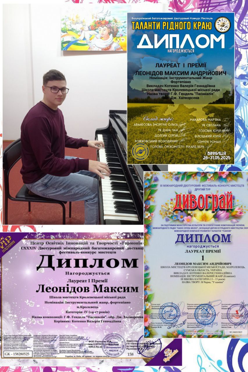 🎶 Леонідов Максим – Лауреат I премії у трьох різних конкурсах (номінація – інструментальний жанр, фортепіано🎹🏆):