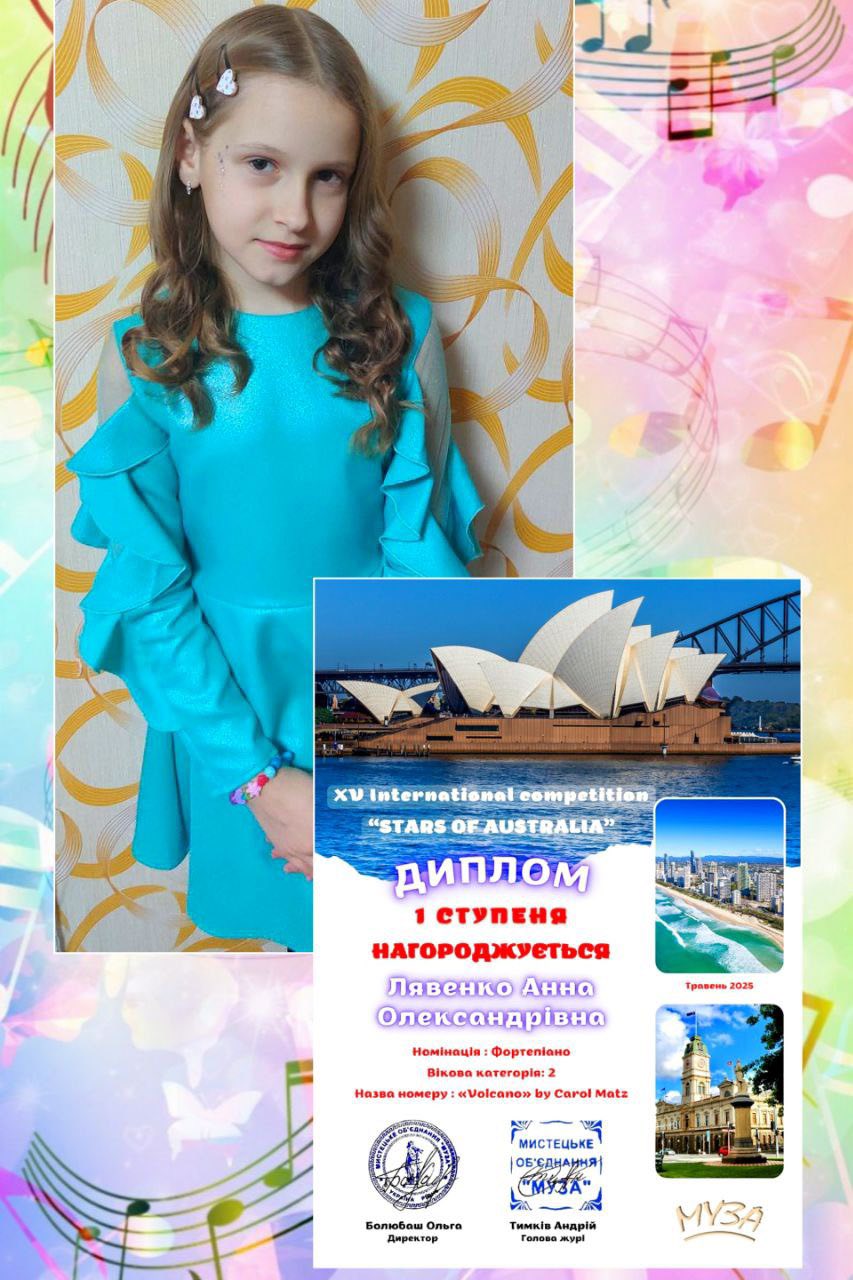 🎶 Лявенко Анна – Диплом I ступеня у XV Міжнародному конкурсі – “Зірки Австралії” (номінація – фортепіано🎹)