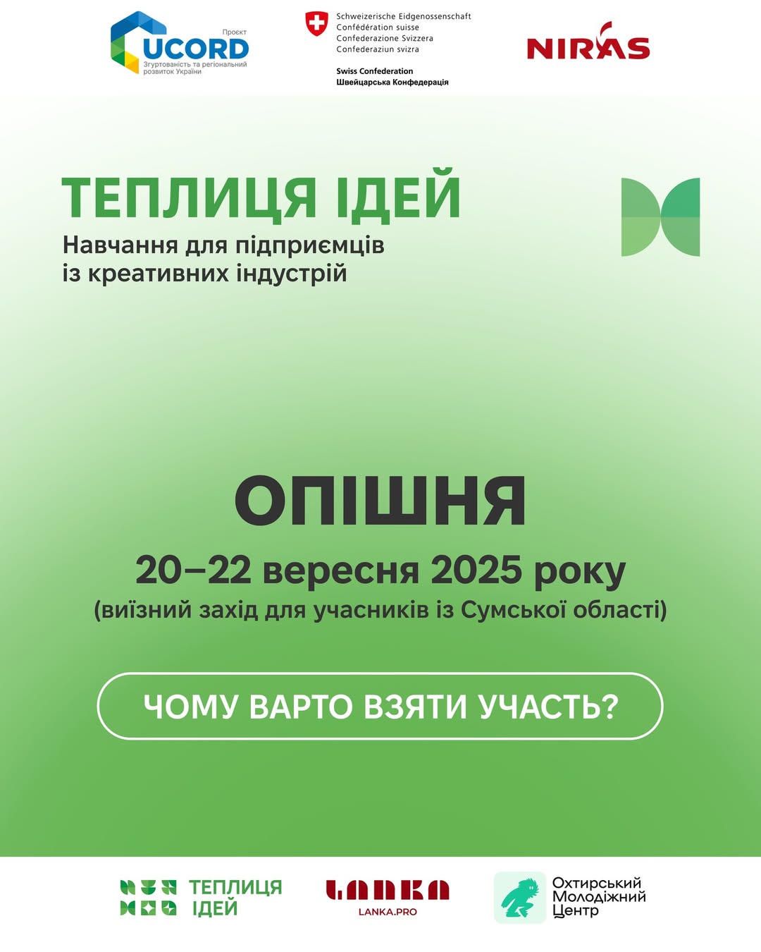 💚 Чудова нагода для тих, хто прагне розвивати власний бізнес у сфері культури та креативних індустрій! 🔰 Громадська організація “Охтирський молодіжний центр” інформує про унікальну можливість для підприємців-початківців або тих, хто вже має ідею і готовий зробити перший крок до її реалізації. 📶 Ключова умова для участі – ваш бізнес має базуватися на творчості та інноваційності. ⁉️ Участь в інтенсиві надасть вам: 👉🏻 Доступ до практичного навчання, спеціально розробленого для підприємців креативних індустрій. 👉🏻 Можливість детально проаналізувати власну бізнес-ідею або вже існуючий проєкт. 👉🏻 Цінні поради від досвідчених практиків та визнаних експертів галузі. 👉🏻 Шанс налагодити контакти з колегами по сектору на обласному рівні, розширюючи свою професійну мережу. 👉🏻 Офіційний сертифікат про проходження навчання. 👉🏻 Підготовку до подальшої участі у грантовому конкурсі програми «Теплиця ідей». 📗 Серед основних тем, що будуть висвітлені: засади креативної економіки, глибоке вивчення вашої бізнес-ідеї чи продукту, аналіз цільової аудиторії та споживачів, розробка ефективної бізнес-моделі та оптимізація операційних процесів, а також стратегічне планування розвитку. ➡️ Навчальні заходи для підприємців із Сумської області пройдуть у мальовничому місті Опішня з 20 по 22 вересня 2025 року. Не пропустіть свій шанс! Заявки приймаються до 6 серпня. ✍️ Подати заявку можна, скориставшись посиланням: https://forms.gle/DvNLWBj1ZZw8LPRP9 ✅ 📌 Детальнішу інформацію про цю унікальну можливість для розвитку вашого бізнесу ви знайдете тут: https://ucord.in.ua/news-and-event/ogoloshuyemo-start-pryjomu-zayavok-na-uchast-u-navchalnyh-intensyvah-teplyczya-idej-dlya-pidpryyemcziv-iz-kulturnyh-ta-kreatyvnyh-industrij/ 📜 Ці навчальні інтенсиви є невід’ємною частиною програми «Теплиця ідей». Ця програма активно підтримує підприємців, які працюють у сфері культури та креативних індустрій, у шести ключових областях України: Вінницькій, Сумській, Хмельницькій, Тернопільській, Волинській та Одеській. 🍀 Реалізація програми здійснюється під егідою швейцарсько-українського проєкту UCORD, за фінансової підтримки Швейцарії через Швейцарську агенцію розвитку та співробітництва (SDC). Технічним виконавцем виступає компанія NIRAS Sweden AB. 🤝 Інформаційним партнером навчальних інтенсивів є @lanka.pro_. Локальну координацію проєкту на території Сумської області забезпечує Охтирський молодіжний центр у тісній співпраці з Агенцією регіонального розвитку Сумщини. Дякуємо за підтримку Агенції регіонального розвитку Сумської області, Охтирського Молодіжного Центру та Проєкту UCORD.