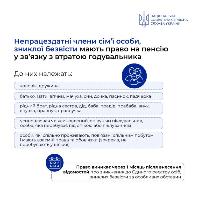 📌 Пенсія призначається через 1 місяць після внесення особи до Єдиного реєстру зниклих безвісти.