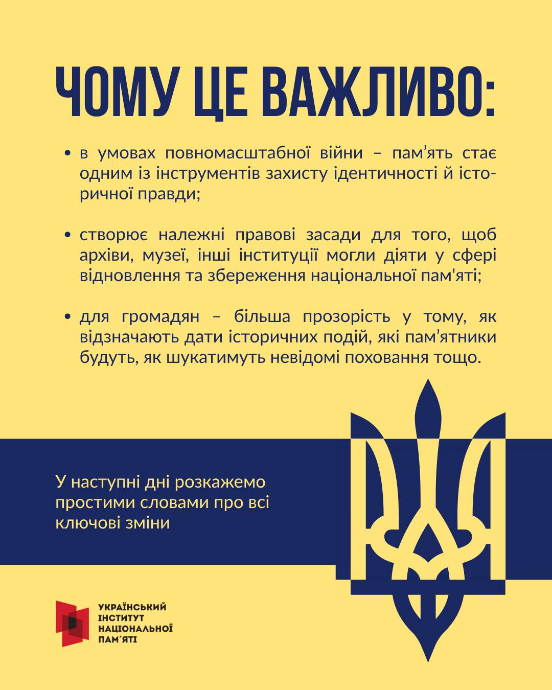 У найближчі дні ми детально розкажемо простими словами про всі ключові зміни, що пов’язані із цим важливим законом. Ми прагнемо зробити інформацію максимально доступною та зрозумілою для кожного українця. Слідкуйте за нашою серією публікацій під хештегом #НоваПолітикаНацПамяті, щоб бути в курсі найважливіших нововведень.