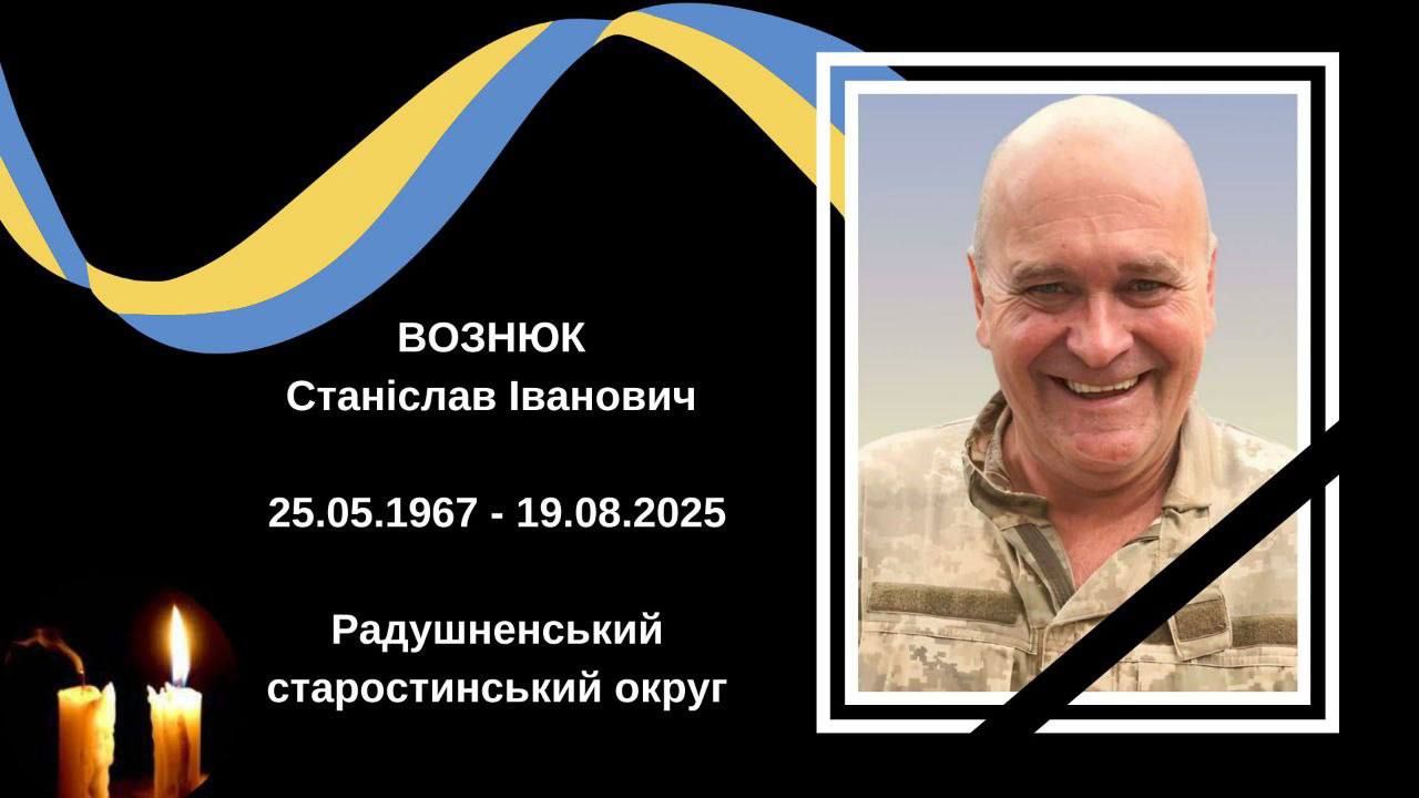 Новопільська громада з глибоким сумом сповіщає про героїчну загибель нашого земляка, вірного захисника України, старшого лейтенанта ВОЗНЮКА СТАНІСЛАВА ІВАНОВИЧА. Народився 25.05.1967 року у селищі Радушне. 19 серпня 2025 року, під час виконання бойового завдання, старший лейтенант Вознюк виявив незламну стійкість та надзвичайну мужність у запеклому бою з ворогами поблизу населеного пункту Куп’янськ на Харківщині. Він віддав своє життя заради захисту Батьківщини, за безпеку кожного українця, за мирне майбутнє нашої держави. Ця непоправна втрата глибоко вразила родину, друзів, бойових побратимів та всю громаду. Пам’ять про його відданість, безстрашність та безмежну любов до рідної землі назавжди закарбується в наших серцях. Ми висловлюємо найщиріші співчуття його близьким і розділяємо ваш біль та скорботу. Вічна пам’ять та незгасна слава нашому Герою!🇺🇦