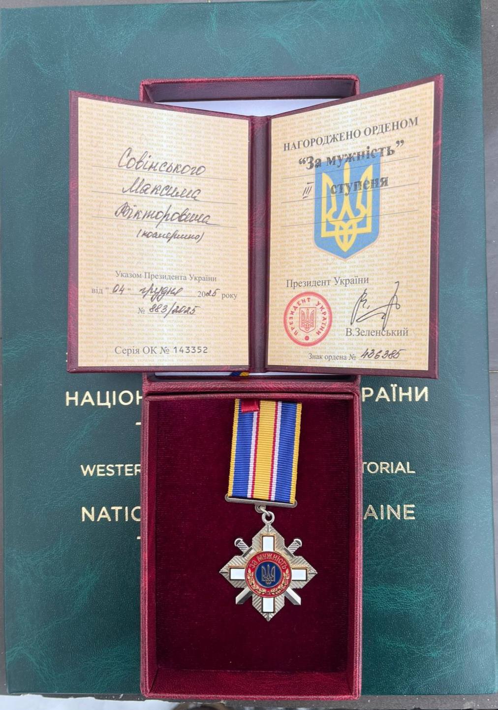🇺🇦 Відповідно до Указу Президента України від 04.12.2025 №883/2025, за особисту мужність і самовіддані дії, виявлені у захисті державного суверенітету та територіальної цілісності України, вірність військовій присязі, Максима Совінського посмертно відзначено орденом “За мужність” III ступеня. Нагороду вручено матері Героя Інні Василівні.