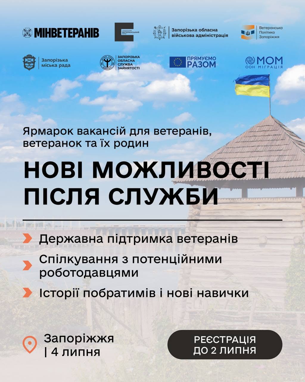 Нові шляхи для працевлаштування, навчання, перекваліфікації, старту чи розвитку власної справи. Ветеранів, ветеранок та членів їхніх родин запрошують на ярмарок вакансій, що відбудеться у Запоріжжі. Про це повідомляє Міністерство у справах ветеранів України.
