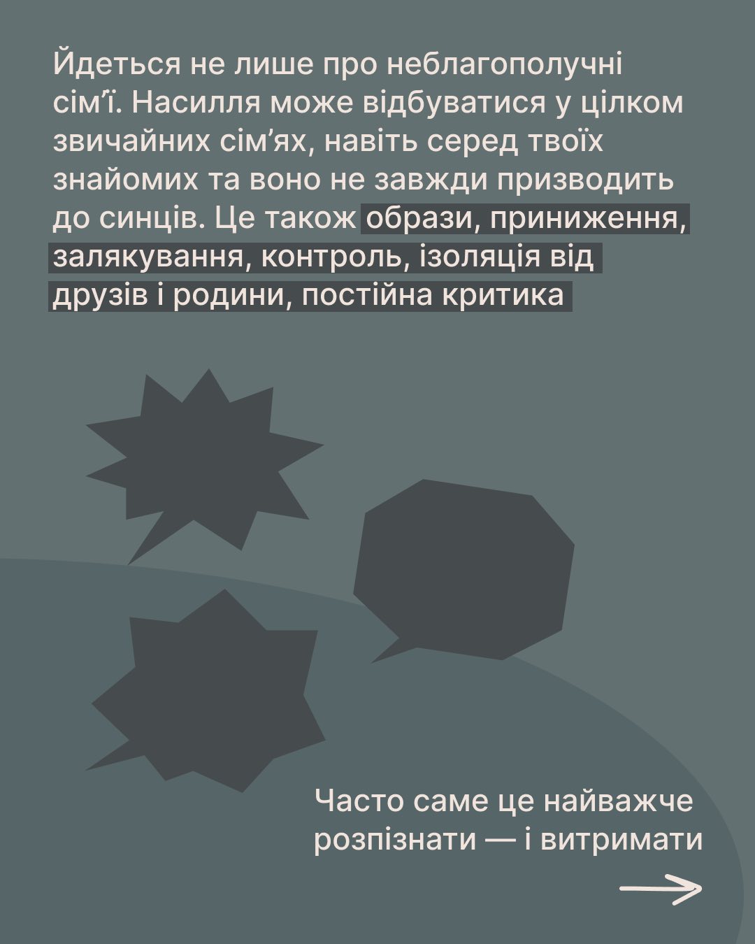 Домашнє насильство може проявлятися у різних формах, включаючи фізичне, психологічне, економічне та сексуальне насильство. Незважаючи на форму, жодна з них не є прийнятною. Якщо ви відчуваєте, що перебуваєте в небезпеці, негайно зверніться за допомогою.