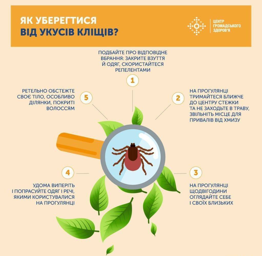 правильно вдягайтеся: заправте штани в шкарпетки, носіть закрите взуття. Краще брати світлий одяг — на ньому кліщі помітніші;