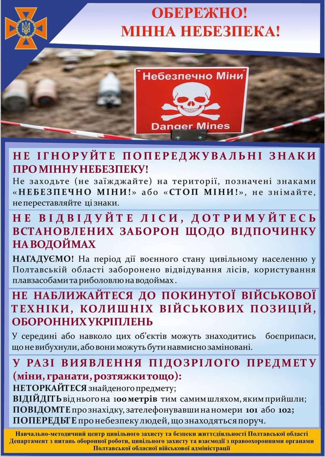 Шановні мешканці громади! Нагадуємо: попри відсутність зафіксованих випадків на території нашої громади, ризик мінної небезпеки залишається актуальним у багатьох регіонах країни. Особливо це стосується лісосмуг, полів, узбіч доріг, водойм, покинутих будівель.
