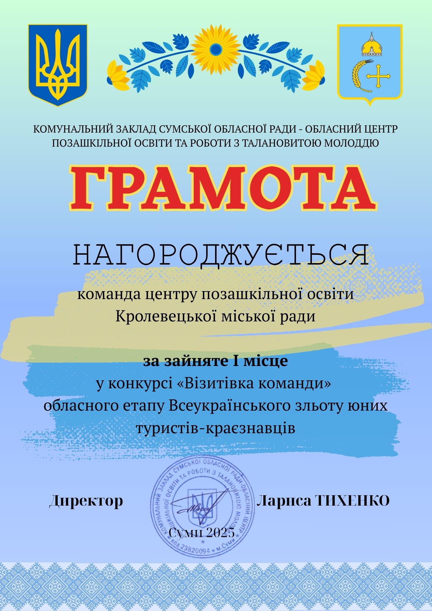 Вітаємо команду туристсько-краєзнавчого напряму з Кролевеччини з вибороним І місцем в обласному етапі Всеукраїнського зльоту юних туристів-краєзнавців! Ця перемога – результат наполегливої праці, взаємопідтримки та віри в спільний успіх.
