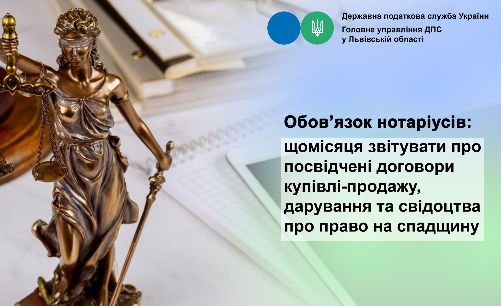✅ Головне управління Державної податкової служби у Львівській області інформує нотаріусів про важливі зміни, що набирають чинності з 01 січня 2025 року. Відповідно до Закону України від 10 жовтня 2024 року № 4015-ІХ «Про внесення змін до Податкового кодексу України та інших законів України щодо забезпечення збалансованості бюджетних надходжень у період дії воєнного стану», нотаріуси зобов’язані щомісяця подавати до контролюючого органу детальну інформацію про посвідчені договори купівлі-продажу рухомого та нерухомого майна, договори дарування, а також свідоцтва про право на спадщину.