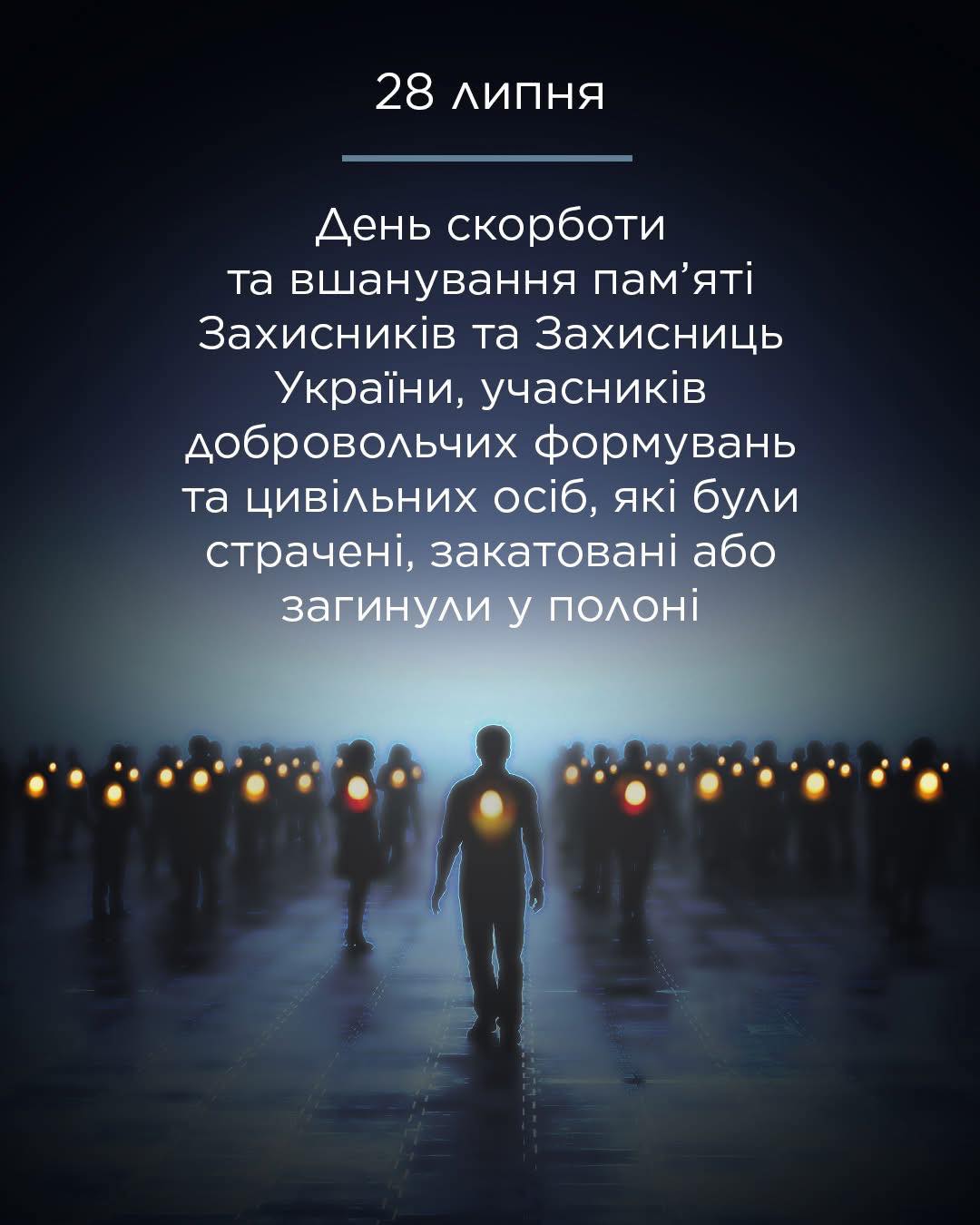 Україна вшановує пам’ять кожного, хто зазнав тортур і загинув у ворожому полоні. Їхня мужність, стійкість і безмежна любов до Батьківщини є прикладом для прийдешніх поколінь. Ми не забудемо їхнього подвигу. Ми пам’ятаємо кожного, хто віддав найцінніше – життя – за свободу та майбутнє нашої країни. Схилимо голови в пам’ять про військових, добровольців і цивільних, які стали жертвами російської агресії. Ця трагедія – незагойна рана на серці нації, але й нагадування про ціну, яку ми платимо за нашу незалежність. Наша пам’ять – це наша зброя проти забуття і знецінення героїзму. Зупинимося на мить, щоб помолитися, згадати та подякувати тим, хто боровся до останнього. Їхня жертва не буде марною. Вічна пам’ять героям, які не зламалися під тиском ворога і віддали життя за Україну.