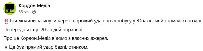 Місцеве видання “Кордон.медіа” повідомило, що внаслідок ворожого удару по автобусу в Юнаківській громаді загинули троє людей, ще 20 отримали поранення. Ця інформація, хоч і неофіційна, свідчить про серйозність наслідків атаки. Наразі офіційна влада ще не надала підтверджених даних щодо кількості жертв, проте всі екстрені служби працюють над збором інформації та наданням допомоги постраждалим. Цей інцидент є черговим нагадуванням про жорстокість російської агресії та її наслідки для цивільного населення України. Кожен такий випадок вимагає ретельного розслідування та відповідальності винних.