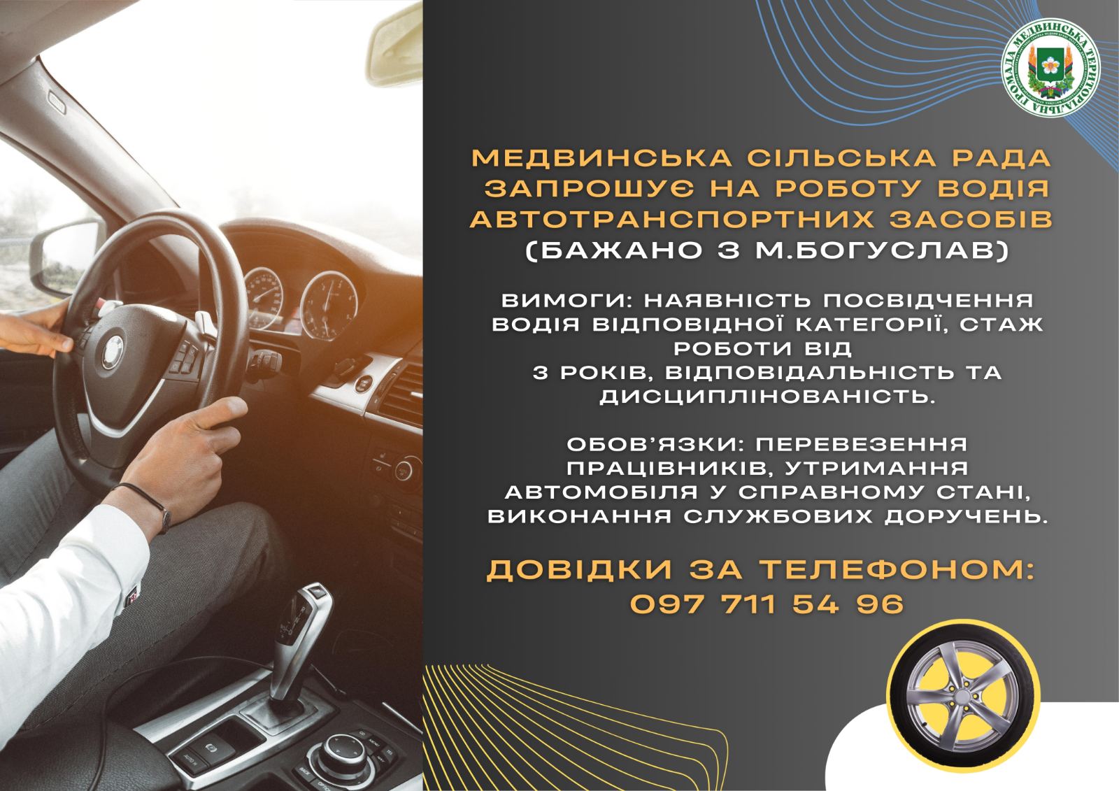 Робота водієм в Медвинській сільській раді: вакансія