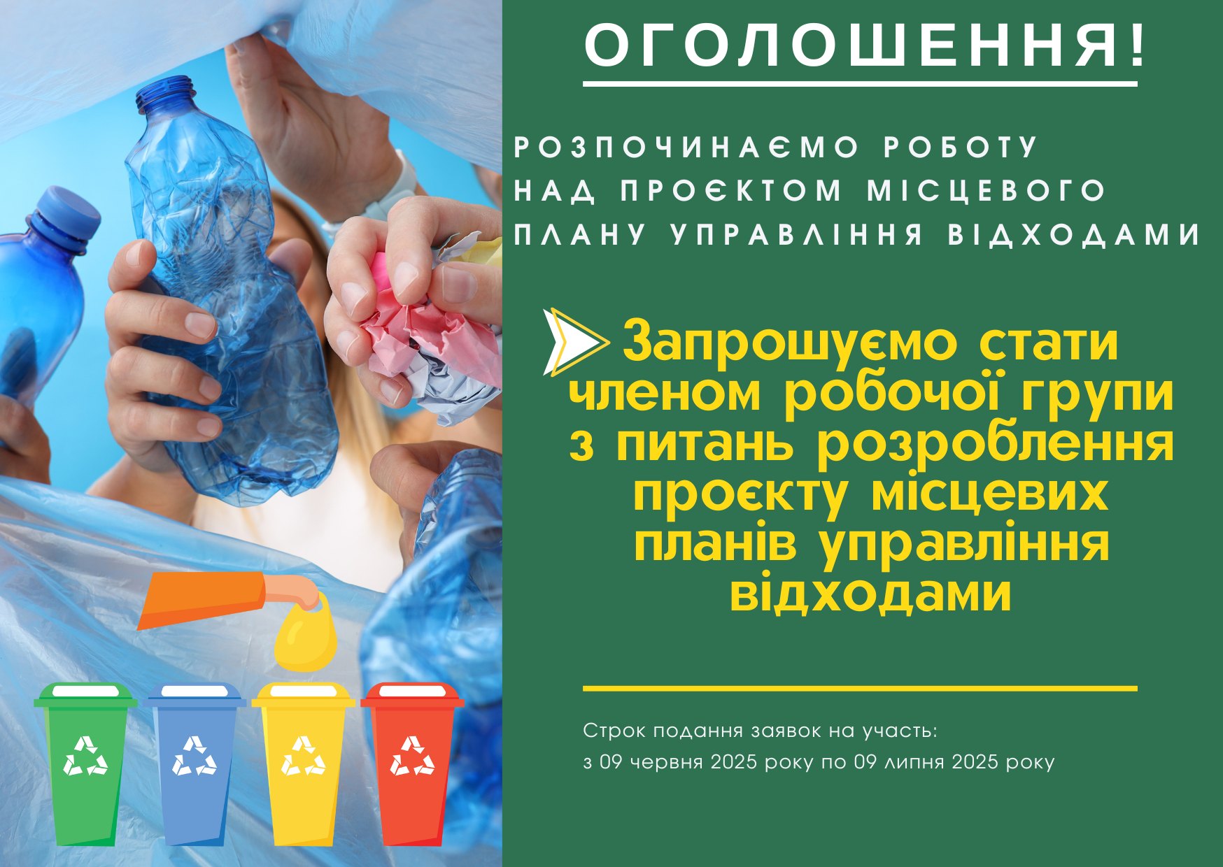 Для забезпечення максимальної прозорості, відкритості та залучення широкого кола зацікавлених сторін, зокрема громадськості, підприємств, установ та організацій, що працюють у сфері поводження з відходами, створено робочу групу з питань розроблення проєкту місцевих планів управління відходами.