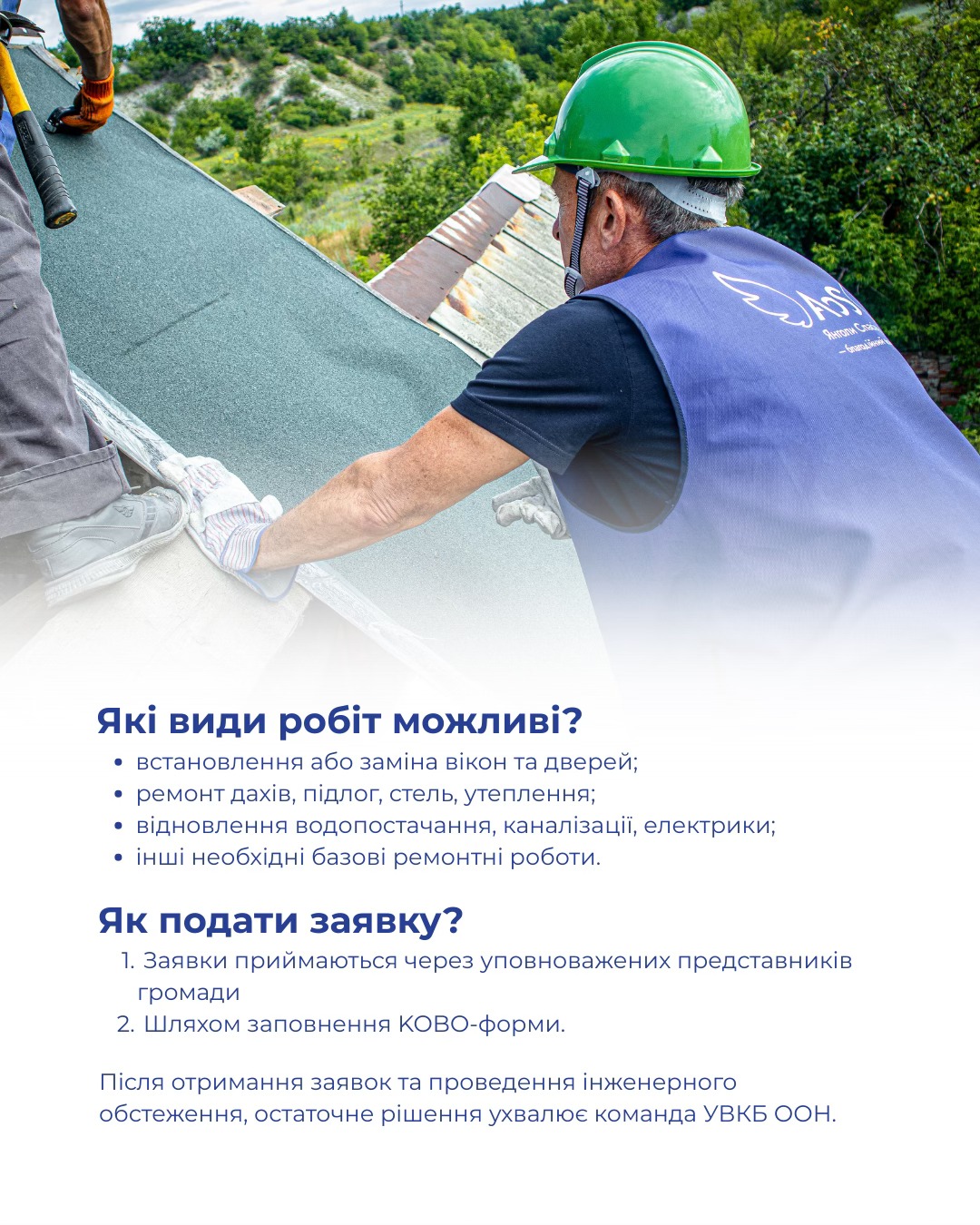 Програма передбачає надання допомоги для здійснення найнеобхідніших видів ремонтних робіт. Мета — забезпечити безпечні та комфортні умови проживання. Це включає ремонт вікон, дверей, даху, підлоги, а також роботи з утеплення, відновлення систем водопостачання, електропостачання, каналізації та інші базові ремонтні заходи. Особлива увага приділяється відновленню життєво важливих комунікацій.