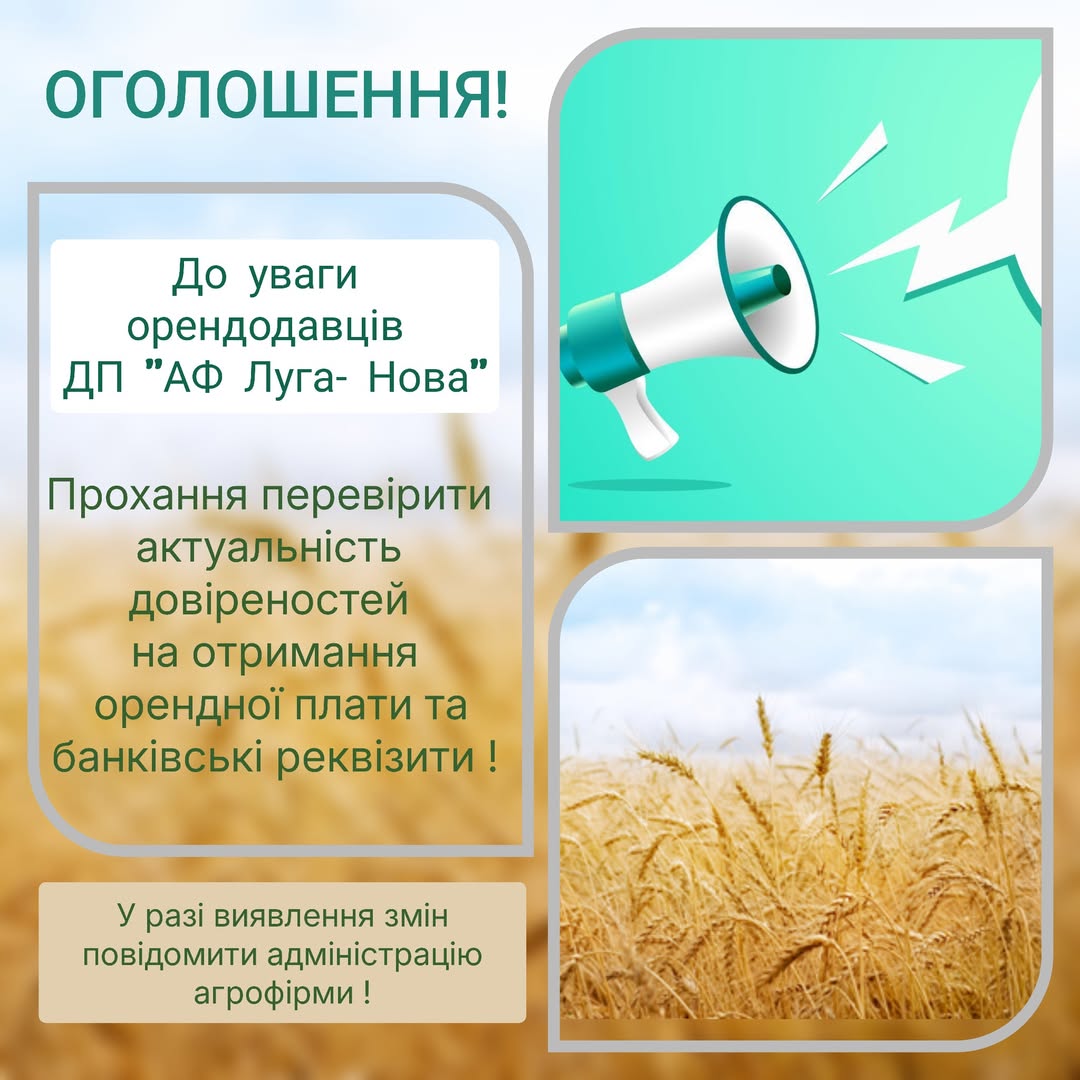 Окрім того, будь ласка, перегляньте та підтвердьте правильність ваших банківських реквізитів. Неточні або застарілі банківські дані можуть призвести до затримок або помилок у виплаті орендної плати. Якщо ви виявили будь-які зміни у ваших довіреностях чи банківських реквізитах, будь ласка, негайно повідомте про це адміністрацію ДП “АФ Луга-Нова”. Надання достовірної та оновленої інформації допоможе нам забезпечити безперебійні та точні розрахунки з усіма орендодавцями.
