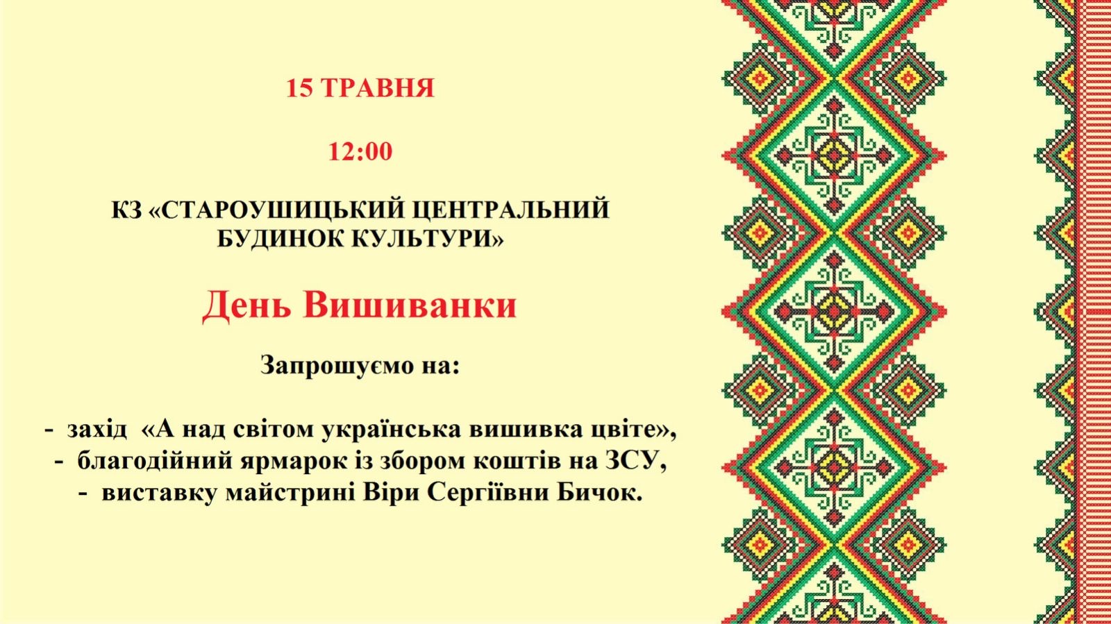 Шановні мешканці та гості Старої Ушиці! Маємо чудову новину! 15 травня о 12:00 біля Центрального будинку культури відбудеться святковий захід, присвячений Дню Вишиванки. Запрошуємо вас на феєричне дійство під назвою «А над світом українська вишивка цвіте»!