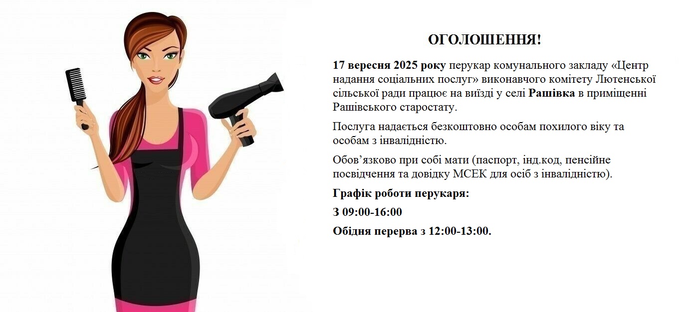 Комунальний заклад «Центр надання соціальних послуг» виконавчого комітету Лютенської сільської ради з гордістю оголошує про важливу соціальну подію для мешканців села Рашівка. 17 вересня 2025 року, спеціаліст нашого центру, перукар, надаватиме свої професійні послуги безкоштовно. Ця чудова можливість доступна всім особам похилого віку та особам з інвалідністю, які проживають у селі Рашівка.