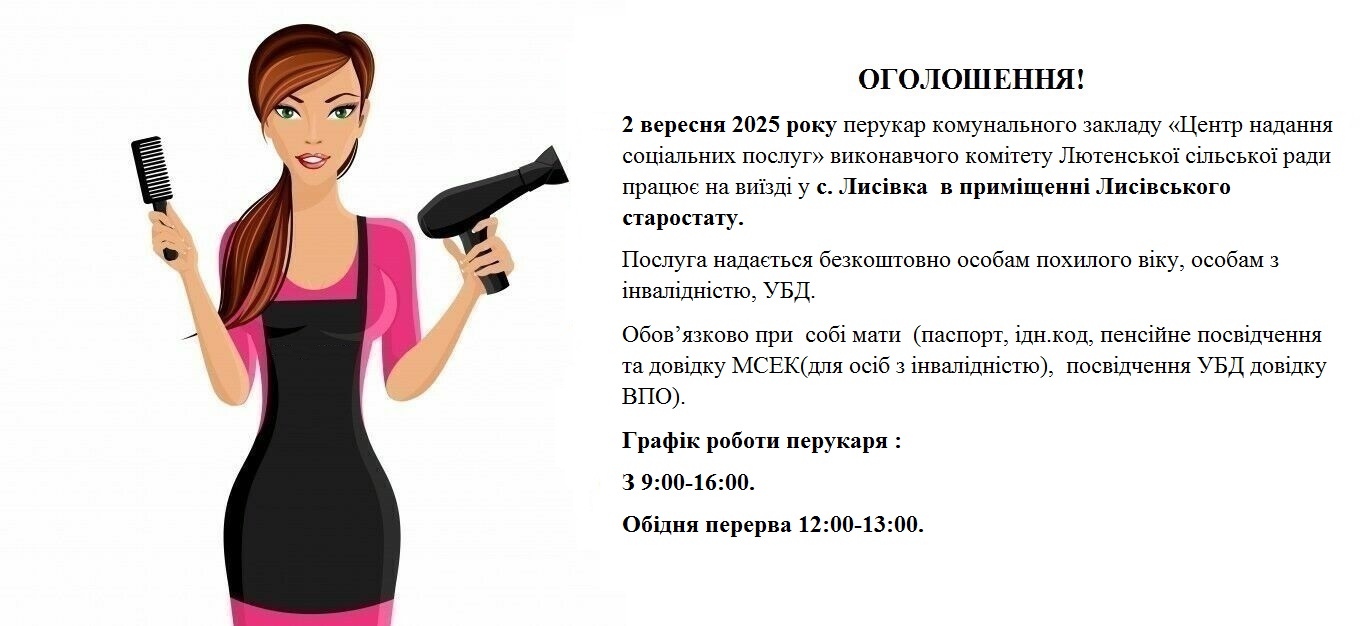 Зверніть увагу! 2 вересня 2025 року відбудеться виїзне надання безкоштовних перукарських послуг для мешканців села Лисівка. Перукар комунального закладу «Центр надання соціальних послуг» виконавчого комітету Лютенської сільської ради буде працювати на місці у приміщенні Лисівського старостату. Ця чудова ініціатива спрямована на підтримку найбільш вразливих верств населення нашої громади.
