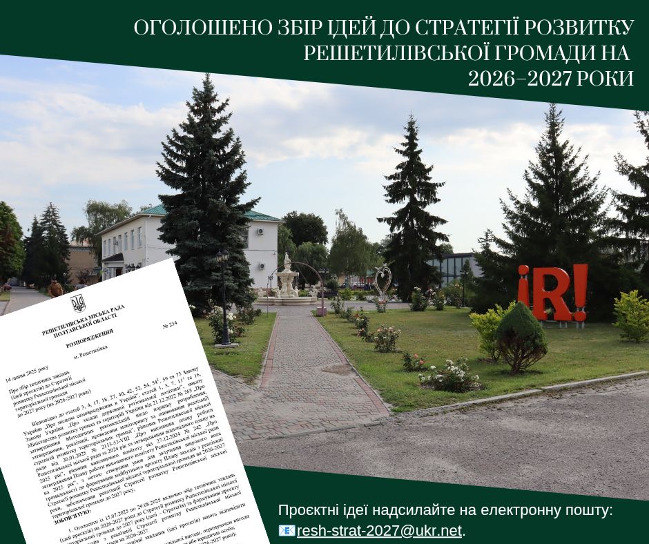 Відповідно до розпорядження міського голови від 14.07.2025 №234, у період з 15 липня по 29 серпня 2025 року триває збір технічних завдань (ідей проєктів) до Стратегії розвитку Решетилівської міської територіальної громади до 2027 року (на 2026–2027 роки).