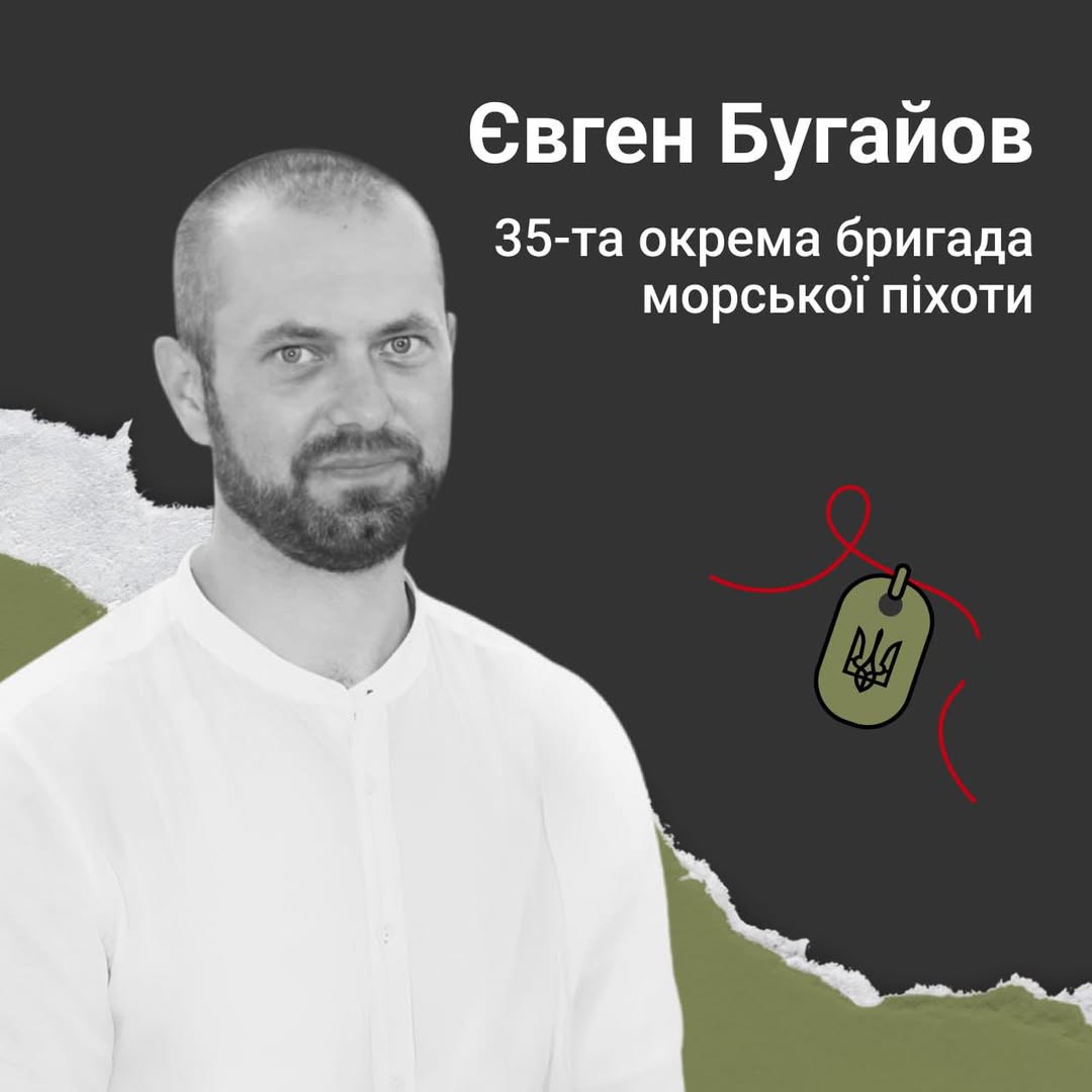 33-річний старший сержант Євген Бугайов, з позивним «BEN», загинув 1 жовтня 2022 року під час контрнаступу біля села Давидів Брід, Херсонської області. Його батальйон потрапив під ворожий обстріл у лісосмузі. Коли було поранено ротного, Євген Бугайов кинувся на допомогу, але куля влучила йому в груди, бронежилет не захистив.