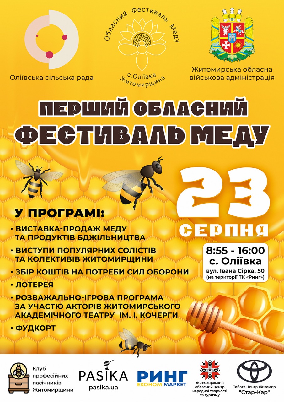 Оліївська громада та Житомирська обласна військова адміністрація запрошують усіх охочих на унікальний Перший Обласний фестиваль меду. Ця подія має на меті не лише зберегти та примножити багаті традиції українського бджільництва, але й створити платформу для обміну цінним досвідом між бджолярами. Фестиваль також стане чудовою нагодою для популяризації натуральних, цілющих бджолиних продуктів серед широкого загалу.