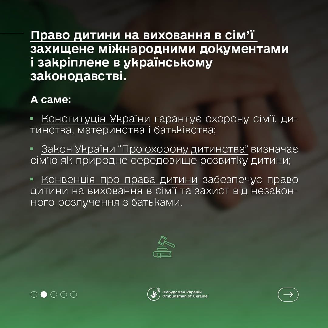 Право дитини на сім’ю – це фундаментальне право, яке забезпечує її психологічний, емоційний та соціальний розвиток. Відсутність батьківського піклування або перебування дитини в несприятливих умовах може мати довготривалі негативні наслідки. Тому держава через інститут омбудсмена та законодавчі норми намагається максимально захистити це право.