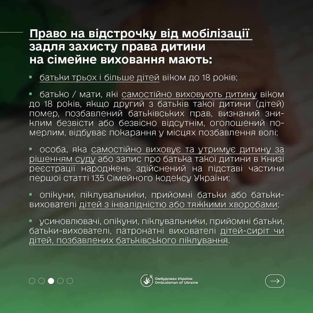 👉 Ця інфографіка покликана роз’яснити важливі гарантії захисту права дитини на сімейне виховання, передбачені чинним законодавством України. Вона детально пояснює, у яких конкретних випадках батьки або законні представники можуть отримати відстрочку від мобілізації, щоб зберегти стабільне та безпечне сімейне середовище для своїх дітей. Важливо розуміти, що захист прав дитини є пріоритетом, і держава прагне забезпечити умови для її всебічного розвитку навіть у найскладніші часи.