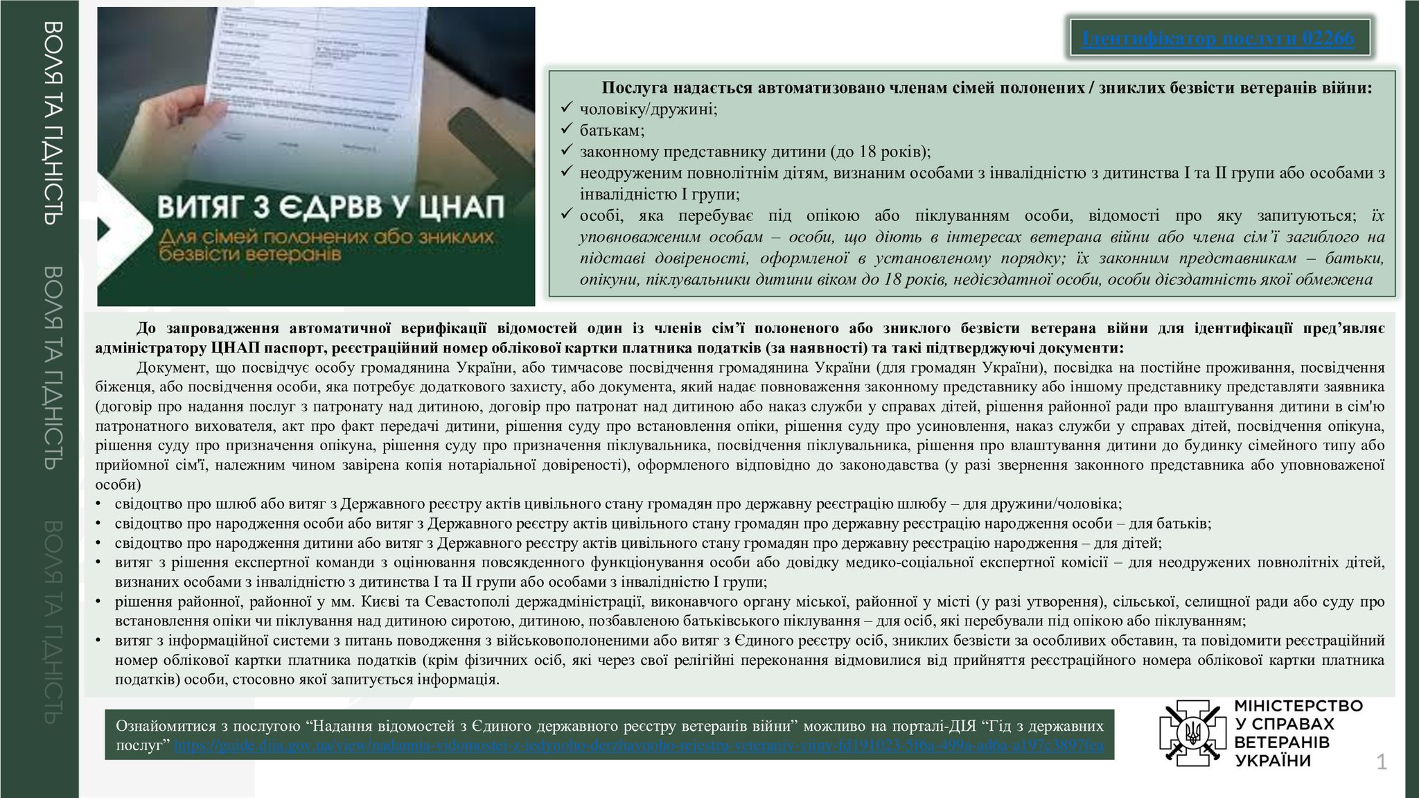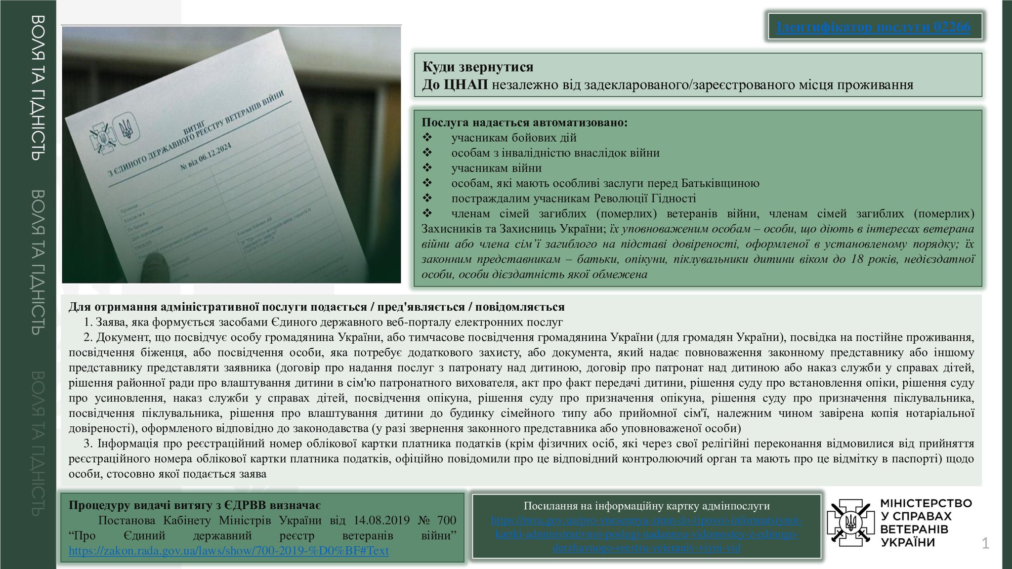 У зв’язку зі змінами до Положення про Єдиний державний реєстр ветеранів війни, затвердженого постановою Кабінету Міністрів України від 14 серпня 2019 року №700, Департамент соціальної політики Міністерства у справах ветеранів України оновив інформаційно-презентаційні матеріали щодо адміністративної послуги «Надання відомостей з Єдиного державного реєстру ветеранів війни».