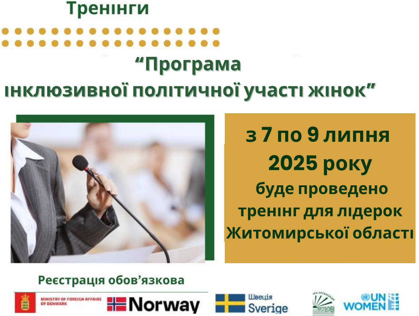 У сучасному суспільстві, особливо в період відбудови та трансформацій, надзвичайно важливим є повноцінне залучення всіх верств населення до процесу прийняття рішень. Саме тому, з метою посилення ролі жінок у розбудові демократичних інститутів та забезпечення їхньої гідної представленості на всіх рівнях, в Україні стартує масштабна ініціатива. ООН Жінки, спільно з надійним партнером – ГО «Центр Жіночі Перспективи», за підтримки урядів Данії, Норвегії та Швеції, розпочинають впровадження інноваційної «Програми інклюзивної політичної участі жінок». Ця програма є ключовою для забезпечення реального впливу жінок на суспільно-політичне життя країни, особливо в контексті майбутніх повоєнних виборів, що стануть визначальним етапом для України.Програма ставить за мету розширити представництво жінок у місцевих та національних органах влади, забезпечуючи їхні голоси та ідеї у всіх процесах прийняття рішень. Це не просто питання гендерної рівності, це питання ефективності та всебічності розвитку країни. Адже досвід та перспективи, які привносять жінки, є незамінними для збалансованого та сталого розвитку.Однією з перших та найважливіших ланок цієї Програми стане серія інтенсивних тренінгів для лідерок регіонів. Зокрема, для жінок Житомирської області такий навчальний курс буде проведено з 7 по 9 липня 2025 року. Це унікальна можливість для активних громадянок здобути нові знання та навички, необхідні для успішної політичної діяльності та ефективного управління громадою.Тематика тренінгу охоплює ключові аспекти, що є фундаментальними для сучасної лідерки. Учасниці матимуть змогу зануритись у вивчення трансформаційного лідерства, що передбачає розвиток здатності надихати та вести за собою, адаптуватися до змін та формувати спільне бачення майбутнього. Важливим блоком стане комунікація та етичні аспекти виборчого процесу – знання, які є критично важливими для прозорої, чесної та ефективної взаємодії з виборцями та опонентами. Окрему увагу буде приділено ґендерно чутливому плануванню, що дозволить інтегрувати гендерну перспективу у всі сфери управління та розробки політики, враховуючи потреби та інтереси як чоловіків, так і жінок. Нарешті, блок управління громадою надасть практичні інструменти для ефективного вирішення локальних проблем та розвитку територіальних громад.Організатори щиро запрошують усіх зацікавлених жінок Житомирщини скористатися цією унікальною нагодою. Ваша жіноча політична участь – це інвестиція у майбутнє регіону та всієї країни. Це шанс отримати знання від провідних експертів, обмінятися досвідом з однодумцями та знайти нові шляхи для реалізації свого потенціалу.Пам’ятайте ключові деталі:📅 Дата: 7 липня 2025 року🕙 Час: 10:00🏨 Місце: Сучасний та комфортабельний готель «Optima Collection Житомир», розташований за адресою: м.Житомир, вул. Малікова, 5/8.Для реєстрації та отримання можливості стати частиною цієї важливої ініціативи необхідно заповнити анкету за посиланням: 👉 http://forms.gle/f9tfPh8huh7utWxh6.Разом, завдяки активній жіночій політичній участі та прагненню до змін, ми будуємо сильне, інклюзивне суспільство рівних можливостей для кожного громадянина України. Ця програма є кроком до створення майбутнього, де голос кожної жінки має значення та впливає на долю країни. Долучайтеся до формування майбутн
