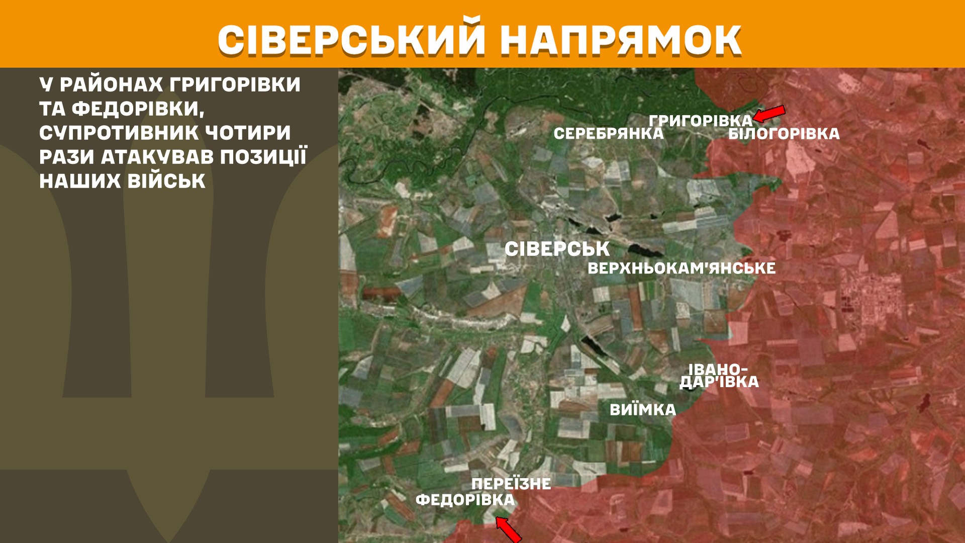На Сіверському напрямку, у районах Григорівки та Федорівки, супротивник чотири рази атакував позиції наших військ.