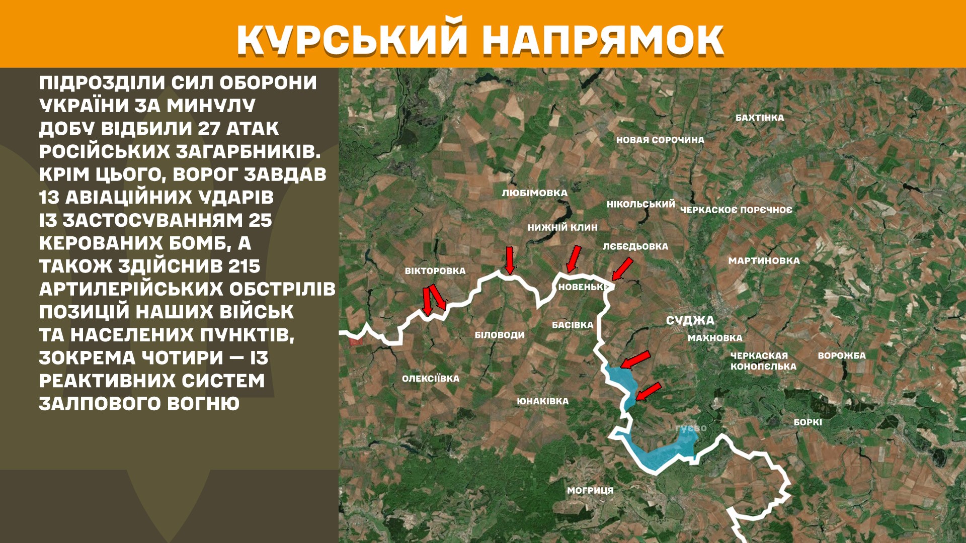 На Новопавлівському напрямку Сили оборони відбили 19 атак на позиції наших військ поблизу населених пунктів Багатир, Одрадне, Рівнопіль, Новосілка, Новопіль, Вільне Поле та в напрямку Запоріжжя, Воскресенки та Шевченко. На Гуляйпільському напрямку минулої доби противник здійснив чотири спроби просунутися вперед поблизу Малинівки. На Оріхівському напрямку наші оборонці успішно відбили три ворожі атаки в бік Новоандріївки та Павлівки. Минулої доби на Придніпровському напрямку ворог двічі без успіху намагався наблизитись до укріплень наших оборонців. На Курському напрямку підрозділи Сил оборони України за минулу добу відбили 27 атак російських загарбників. Крім цього, ворог завдав 13 авіаційних ударів із застосуванням 25 керованих бомб, а також здійснив 215 артилерійських обстрілів позицій наших військ та населених пунктів, зокрема чотири — із реактивних систем залпового вогню.