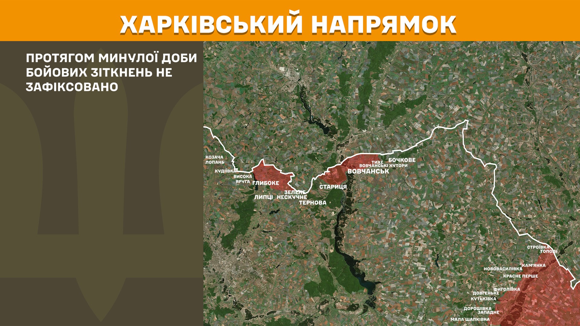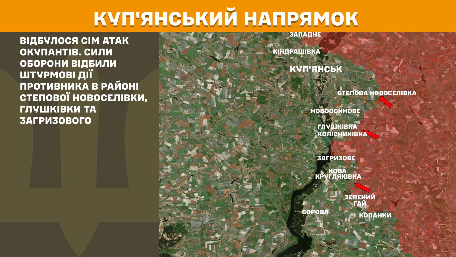 На Харківському напрямку протягом минулої доби бойових зіткнень не зафіксовано. На Куп’янському напрямку відбулося сім атак окупантів. Сили оборони відбили штурмові дії противника в районі Степової Новоселівки, Глушківки та Загризового. На Лиманському напрямку ворог атакував 15 разів. Намагався просунутися вперед поблизу населених пунктів Греківка, Новий Мир, Рідкодуб, Зелена Долина та в бік Чернещини, Торського, Серебрянського лісу. На Сіверському напрямку впродовж дня ворог здійснив чотири штурми на позиції наших підрозділів біля Григорівки, Верхньокам’янського та Виїмки. На Краматорському напрямку зафіксовано шість бойових зіткнень неподалік Білої Гори, Предтечиного та в районі Курдюмівки. На Торецькому напрямку ворог здійснив 19 атак поблизу Дачного, Диліївки, Торецька та в бік Яблунівки. На Покровському напрямку наші захисники зупинили 47 наступальних дій агресора в районах населених пунктів Миролюбівка, Малинівка, Єлизаветівка, Лисівка, Звірове, Удачне, Горіхове, Андріївка та в напрямку Мирного, Миколаївки, Променя, Новосергіївки, Олексіївки.
