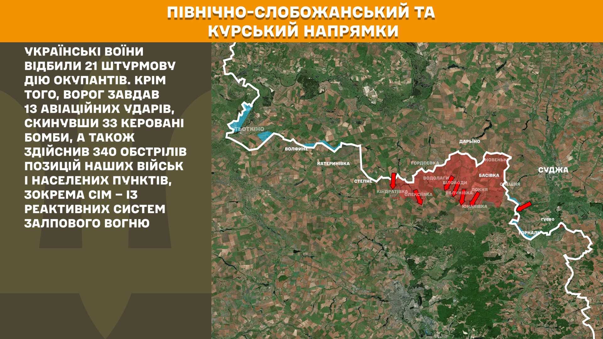 На Північно-Слобожанському і Курському напрямках з початку доби українські воїни відбили 21 штурмову дію окупантів. Крім того, ворог завдав 13 авіаційних ударів, скинувши 33 керовані бомби, а також здійснив 340 обстрілів позицій наших військ і населених пунктів, зокрема сім – із реактивних систем залпового вогню.