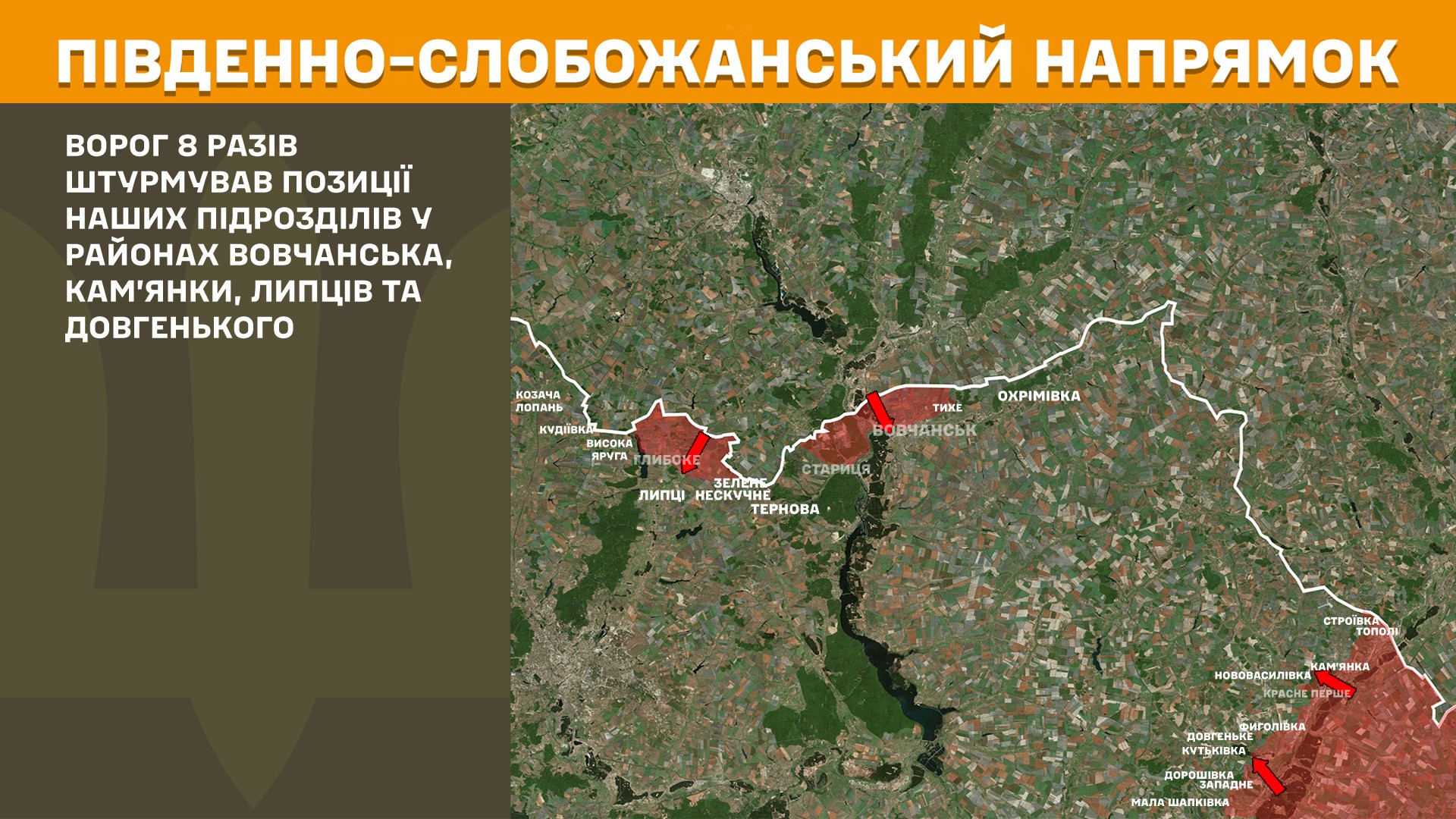 За минулу добу авіація, ракетні війська та артилерія Сил оборони уразили 16 районів зосередження особового складу, озброєння й військової техніки, артилерійський засіб та один пункт управління противника. На Північно-Слобожанському і Курському напрямках відбулося 29 боєзіткнень. Ворог завдав 9 авіаційних ударів, скинув 19 керованих бомб, здійснив 205 артилерійських обстрілів, зокрема один – із реактивних систем залпового вогню. На Південно-Слобожанському напрямку ворог 8 разів штурмував позиції наших підрозділів у районах Вовчанська, Кам’янки, Липців та Довгенького. На Куп’янському напрямку за добу відбулося дві атаки окупантів. Сили оборони відбивали штурмові дії противника в напрямку Степової Новоселівки та поблизу Загризового. На Лиманському напрямку ворог атакував 15 разів, намагаючись просунутися вперед у районах населених пунктів Новий Мир, Ольгівка, Греківка, Липове, Зелена Долина, Торське та в напрямку Шандриголового і Карпівки. На Сіверському напрямку, у районах Григорівки, противник два рази атакував позиції наших військ. На Краматорському напрямку зафіксовано 15 боєзіткнень у районах Оріхово-Василівки, Білої Гори, Курдюмівки, Предтечиного, Новомаркового, Бондарного та Ступочок. На Торецькому напрямку ворог здійснив 15 атак у районах Торецька, Диліївки, Щербинівки та в бік Яблунівки й Новоспаського.