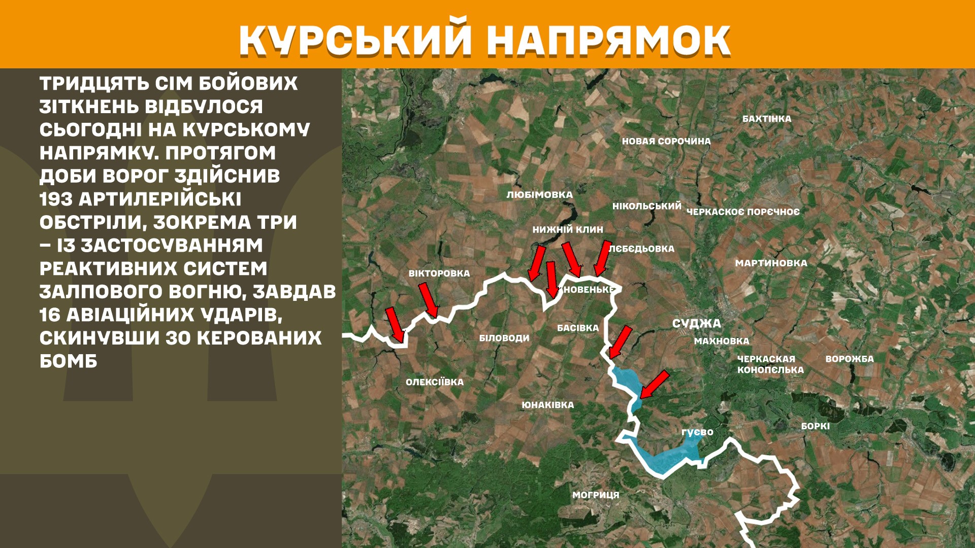 Загалом протягом минулої доби зафіксовано 205 боєзіткнень. Противник завдав по позиціях українських підрозділів та населених пунктах два ракетні удари, застосувавши три ракети та 93 авіаудари, скинувши 176 керованих авіаційних бомб. Крім цього, здійснив 5430 обстрілів, зокрема 158 – із реактивних систем залпового вогню, та залучив для ураження 3279 дронів-камікадзе. Агресор завдавав авіаударів по районах населених пунктів Сумської області та Донецької області, включаючи Великий Прикіл, Угроїди, Есмань, Довга Балка, Зоря, Олександро-Калинове, Новоторецьке, Покровськ, Новоукраїнка, Мирноград, Сухий Яр, Запоріжжя, Комар, Мирне. Також авіаудари зафіксовано по Малинівці Запорізької області.