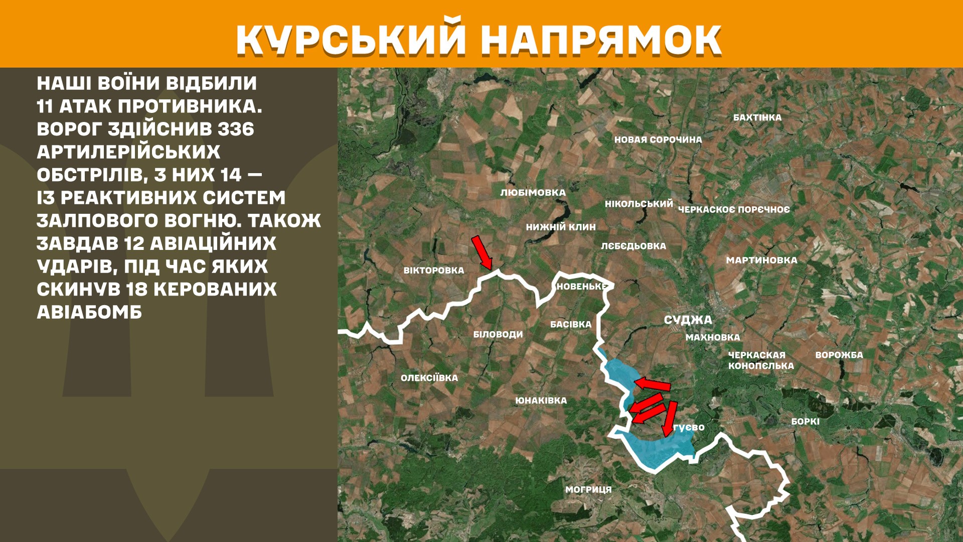На Курському напрямку минулої доби наші воїни відбили 11 атак противника. Ворог здійснив 336 артилерійських обстрілів, з них 14 — із реактивних систем залпового вогню. Також завдав 12 авіаційних ударів, під час яких скинув 18 керованих авіабомб.