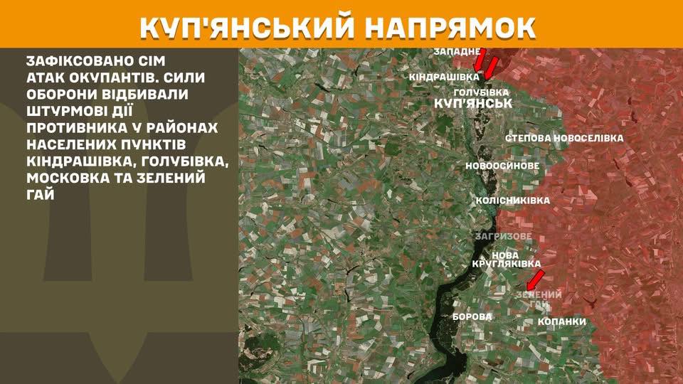На Куп’янському напрямку за добу зафіксовано сім атак окупантів. Сили оборони відбивали штурмові дії противника у районах населених пунктів Кіндрашівка, Голубівка, Московка та Зелений Гай.