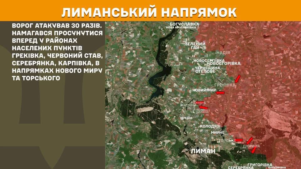 На Лиманському напрямку ворог атакував 30 разів. Намагався просунутися вперед у районах населених пунктів Греківка, Червоний Став, Серебрянка, Карпівка, в напрямках Нового Миру та Торського.