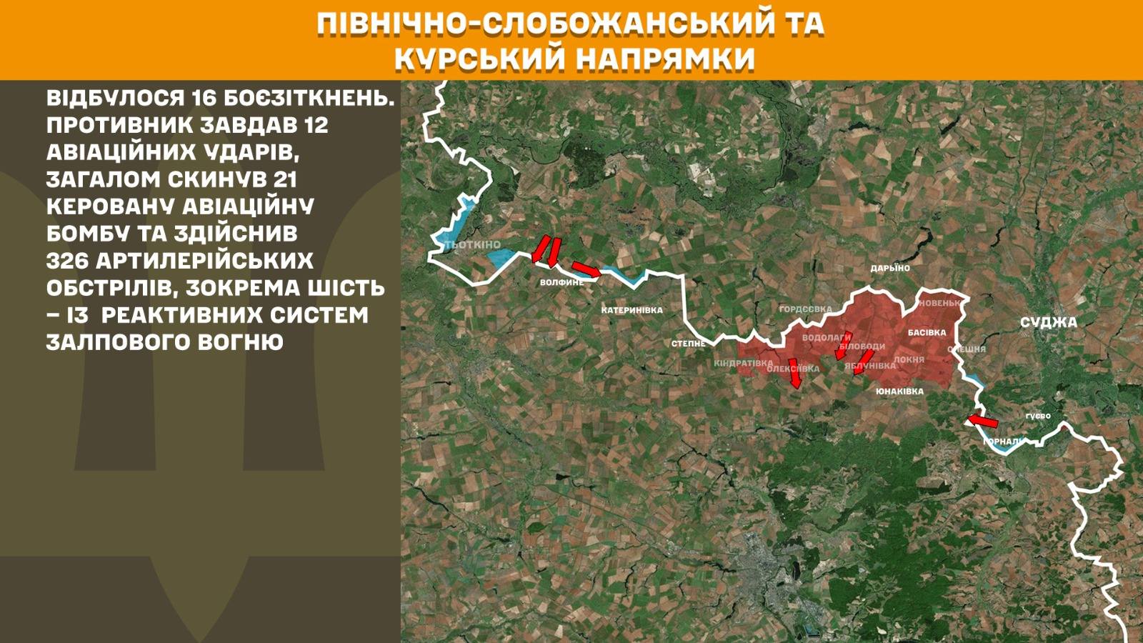 На Північно-Слобожанському і Курському напрямках минулої доби відбулося 16 боєзіткнень. Противник завдав 12 авіаційних ударів, загалом скинув 21 керовану авіаційну бомбу та здійснив 326 артилерійських обстрілів, зокрема шість – із реактивних систем залпового вогню.