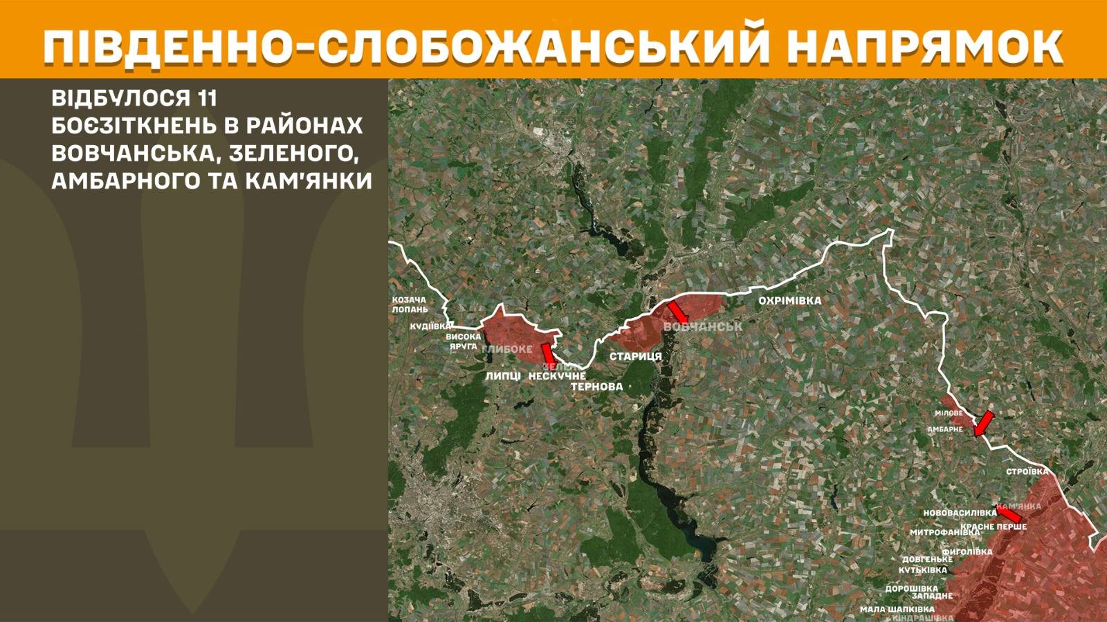 Минулої доби на Південно-Слобожанському напрямку відбулося 11 боєзіткнень в районах Вовчанська, Зеленого, Амбарного та Кам’янки.