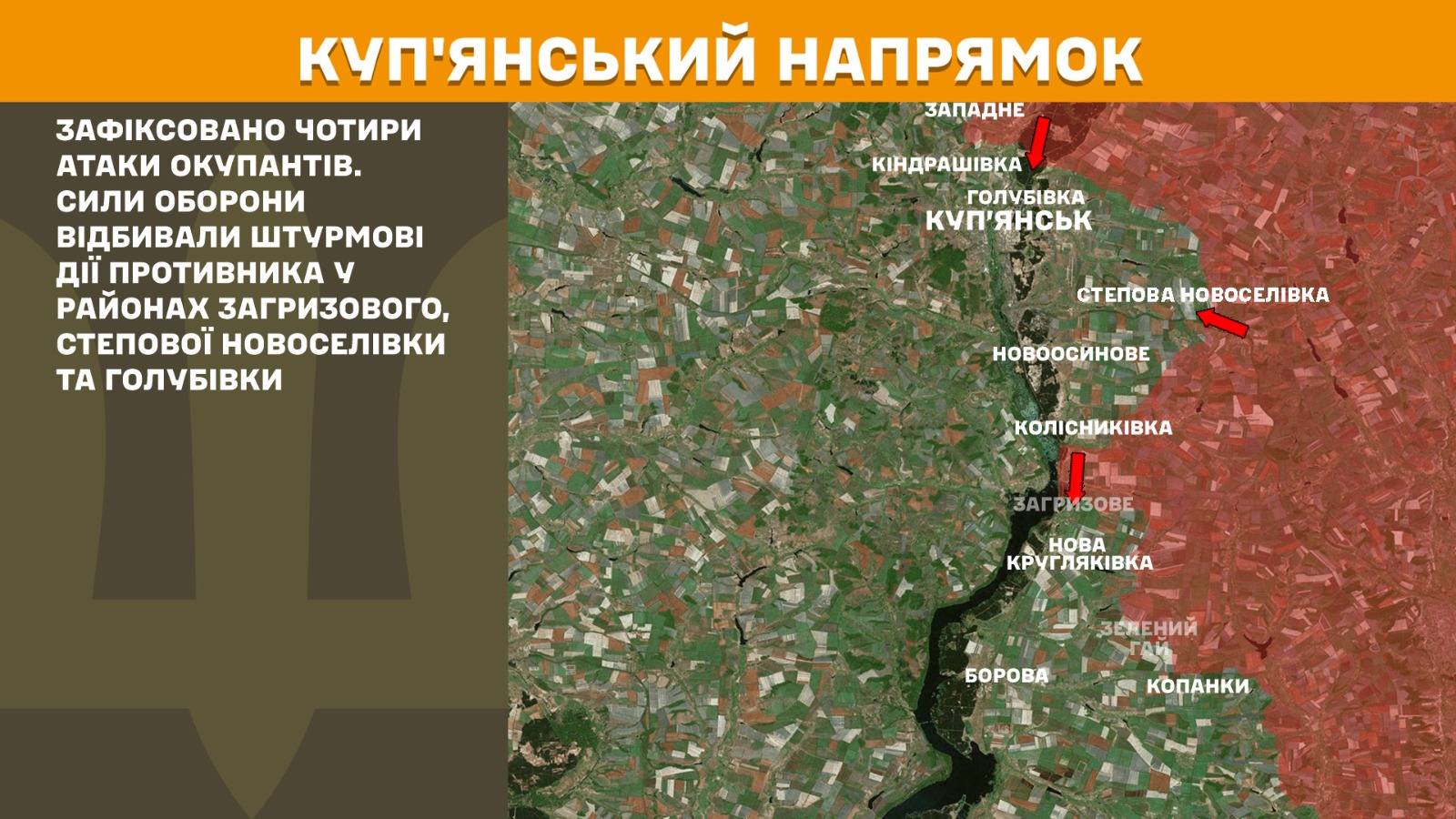 На Куп’янському напрямку за добу зафіксовано чотири атаки окупантів. Сили оборони відбивали штурмові дії противника у районах Загризового, Степової Новоселівки та Голубівки.