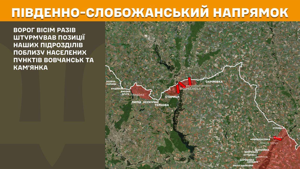 На Південно-Слобожанському напрямку ворог вісім разів штурмував позиції наших підрозділів поблизу населених пунктів Вовчанськ та Кам’янка.