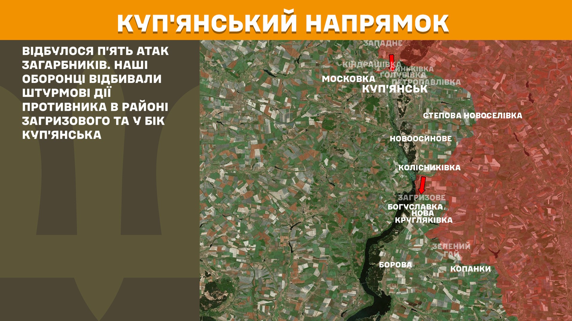 На Куп’янському напрямку зафіксовано п’ять атак загарбників, оборонці відбили штурмові дії противника в районі Загризового та у напрямку Куп’янська.