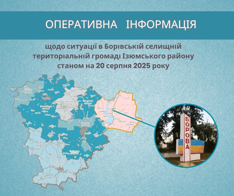 📌 Оперативна інформація щодо ситуації в Борівській селищній територіальній громаді Ізюмського району станом на 20 серпня 2025 року.