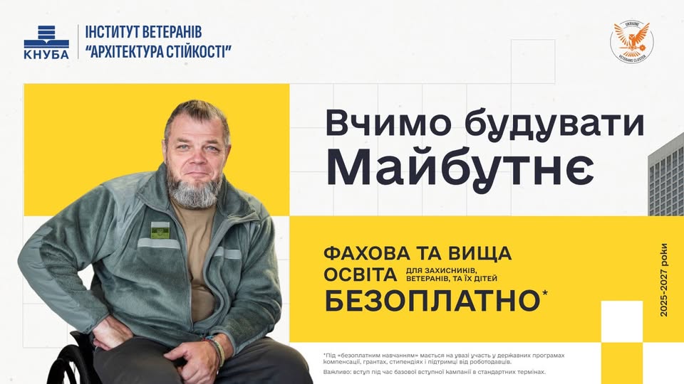 Шановні ветерани, діючі захисники України, члени їхніх родин, внутрішньо переміщені особи (ВПО) та люди з інвалідністю I–II груп! Ветеранський Кластер України (ВКУ) спільно з Інститутом ветеранів (КНУБА) відкриває унікальні освітні можливості. Наш Інститут ветеранів «Архітектура Стійкості» КНУБА створений для здобуття нової професії або підвищення кваліфікації тих, хто захищав нашу країну чи постраждав від агресії.