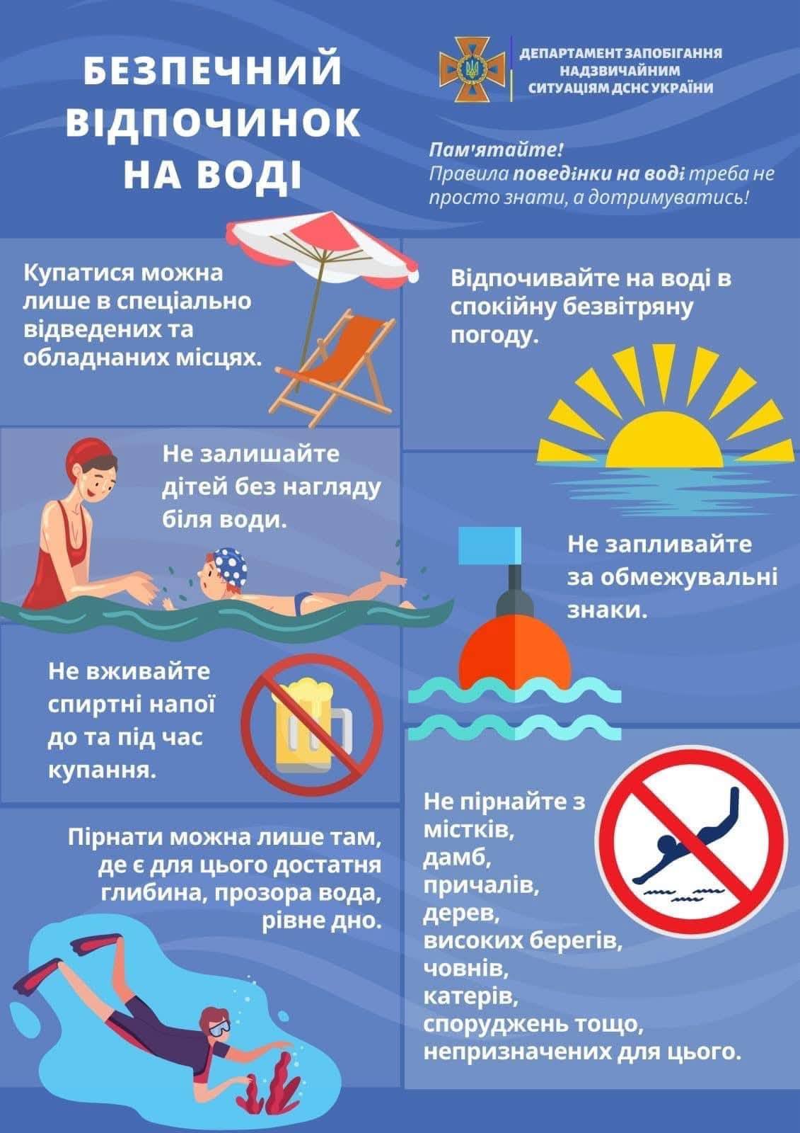 🔹 Відпочивати та купатися слід лише у спеціально відведених та обладнаних місцевою владою місцях. Це гарантує безпечніші умови для водних розваг.